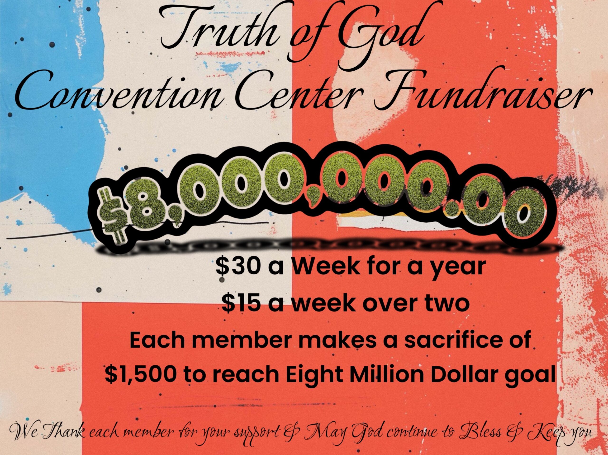 We need all members (brothers and sisters), God willing, to make a sacrifice of $1,500 in order to reach this $8 million dollar goal